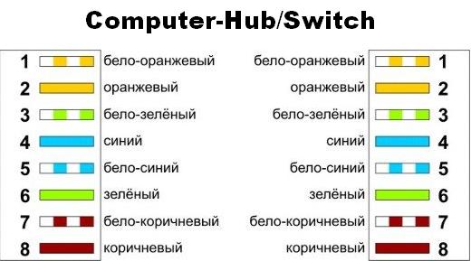 При соединении Computer-Computer (карта-карта) EIA/TIA-568A (так называемый crossover-кабель) используется следующая схема: