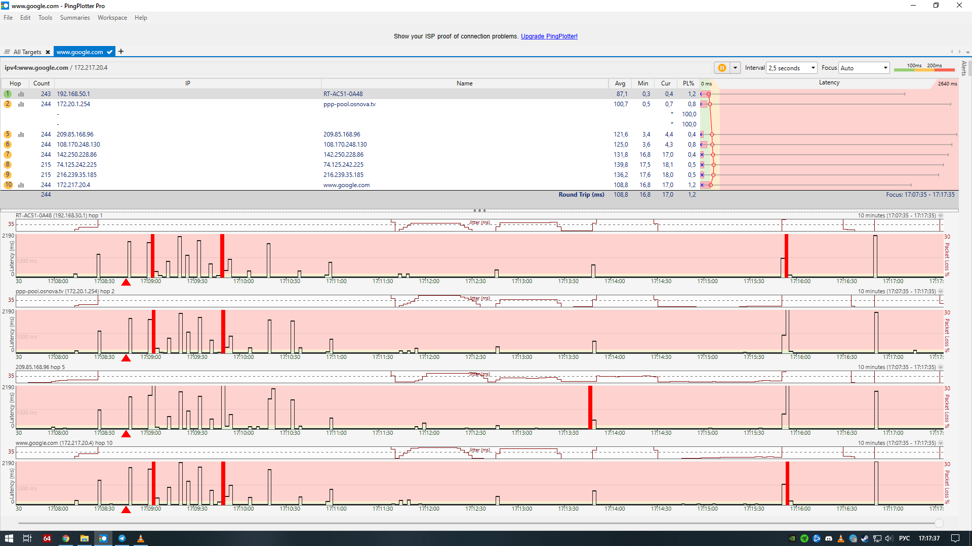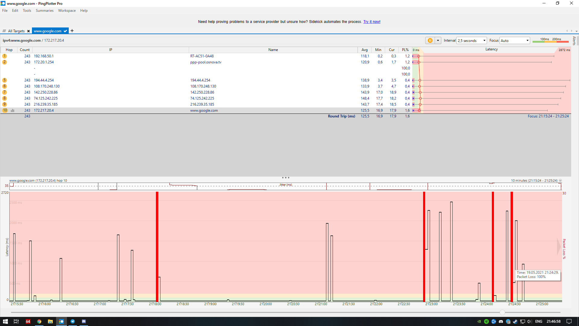 По Вашій лінії з'єднання не переривалося з 16.05.2021 09:44:09, однак конект не пінгується, оскільки Ваш маршрутизатор відкидає ICMP-запити по WAN-порту. На нашому обладнанні впродовж останніх семи днів втрат не зафіксували. З первинного аналізу результатів, що на Вашому скріншоті, бачимо затримки 1,2% вже на першому хопі (Ваш маршрутизатор), хоча затримки на кінцевому хопі теж присутні. Тому прохання показати статистику трасування на маршрутизаторі (у вікні PingPlotter клацнути на рядок першого хопу та зробити скріншот). Також не зайвим буде додати скріншот замірів напряму (без використання маршрутизатора).