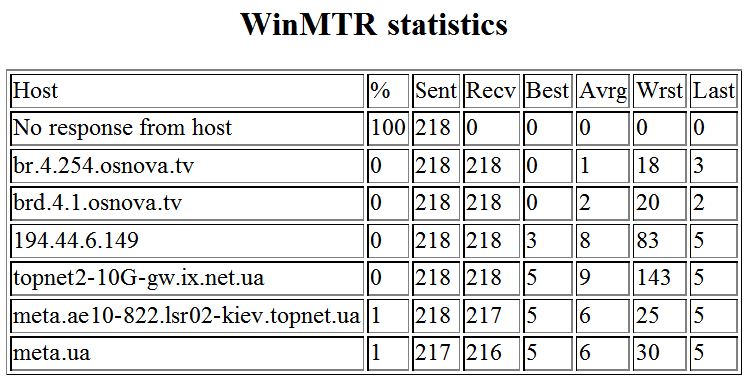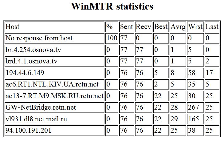 И меня заинтересовала верхняя строка в WinMTR - No response from host и потеря 100% На yahoo.com вообще не смог подключится.